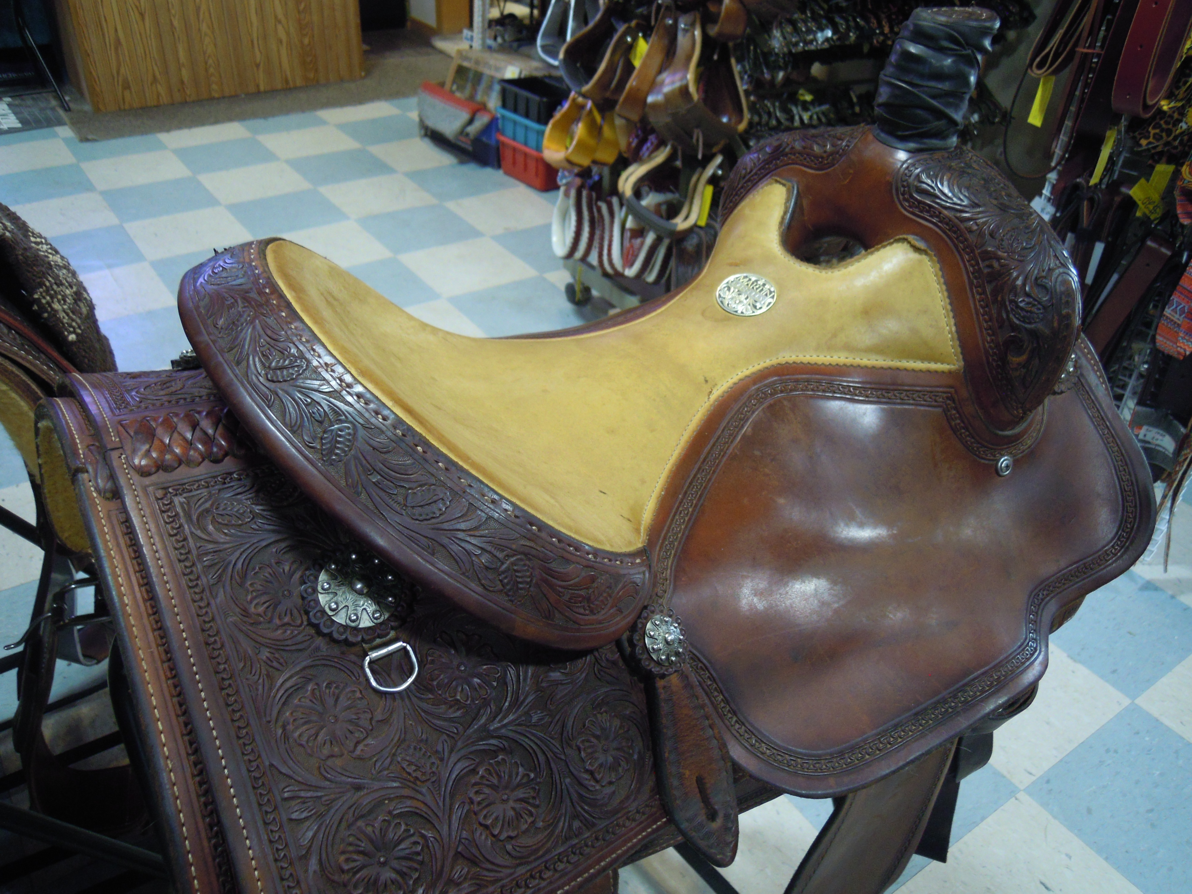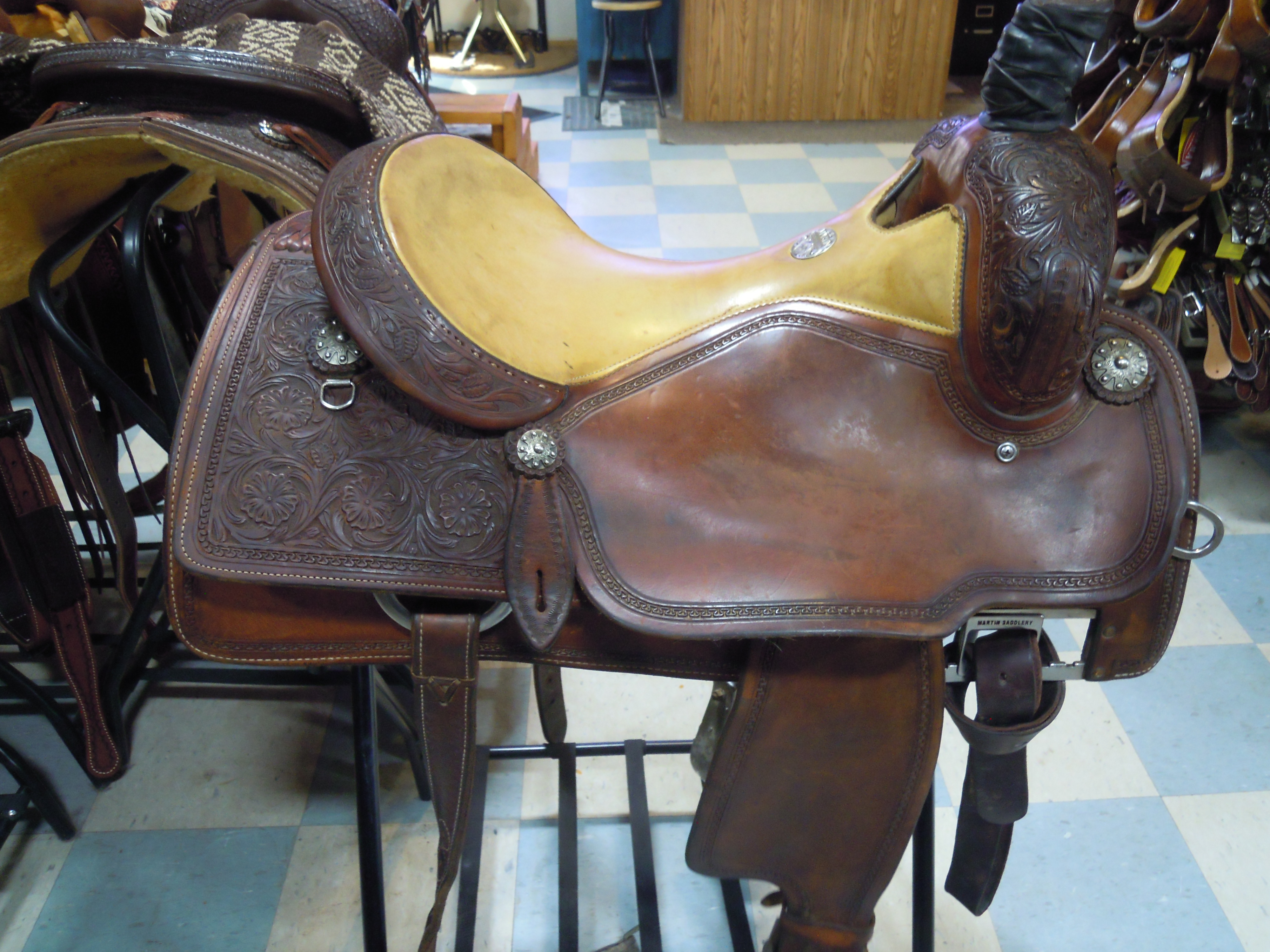 NICE USED ALL AROUND MARTIN SADDLE, 16" SEAT, ADJUSTABLE INSKIRT BUCKLES. CONSIGNMENT